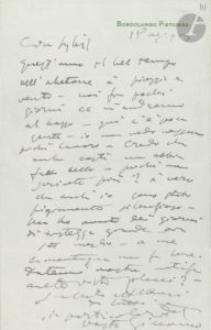 Dans peu de jours, il redescendra. Il y a peu de monde ; il ne voit personne, il travaille : « io non vedo nessuno perchè lavoro ». Il pense que son amie n’a pas eu beau temps. Pourquoi n’écrit-elle pas ? Il est vrai qu’il a été silencieux par paresse ; il a eu des jours de grande tristesse ; la montagne ne lui fait pas de bien : « è vero che anchio sono stato pigromento silenzioso. Ma ho avuto dei giorni di tristezza grande – ora sto meglio – a me la montagna non fa bene »… Il ajoute quelques mots au verso, apprenant que Tosti est en Italie…