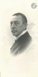 [Sergueï RACHMANINOV (1873-1943)]. Photographie originale, 1918 ; tirage argentique (23 x 11,5 cm).{CR}Belle et rare photographie en buste, signée et datée par le photographe danois Juncker Jensen, 1918 (marque et adresse du photographe de...