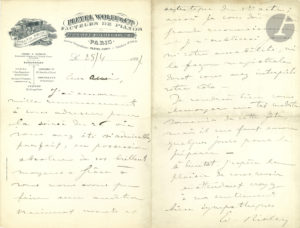Édouard RISLER (1873-1929). L.A.S., 28 avril 1897, à un chanteur ; 2 pages in-8, en-tête et vignette Pleyel Wolff & Cie facteurs de piano. {CR}Le pianiste remercie le chanteur pour une soirée « où vous avez été si admirable, parfait, en...