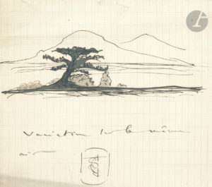 Camille SAINT-SAËNS (1835-1921). Dessin original signé avec légende autographe, et 2 L.A.S., 1913 ; 12 x 13,5 cm, et 4 pages in-8.{CR}Dessin à la plume, encre noire, représentant un paysage japonisant de montagnes, avec un cèdre au premier...