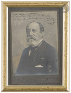 Camille SAINT-SAËNS (1835-1921). Photographie avec dédicace autographe signée, 1915 ; 16 x 11 cm sur carton du photographe Pierre Petit (légères piqures ; sous cadre).{CR}Photographie en buste par Pierre Petit, dédicacée à l’auteur...