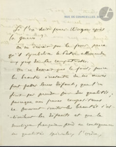 Wagner après la guerre ? On ne devrait pas le jouer parce qu’il symbolise la Patrie allemande aux yeux de ses compatriotes. On ne devrait pas le jouer, parce [que] les beautés écrasantes de ses œuvres font passer leurs défauts, que l’on finit par prendre pour des qualités ; parce que nos jeunes compositeurs ne pouvant imiter les beautés s’assimilent les défauts et que la musique française perd en conséquence ses qualités spéciales, l’ordre, la clarté, le goût. On ne devrait pas le jouer parce que les amateurs se prennent [pour] ses œuvres d’une passion aveugle et intolérante qui leur fait mépriser l’École française, laquelle ne peut vivre si elle n’est ni appréciée ni encouragée. Il faut seulement craindre que Wagner ne prenne le dangereux attrait du fruit défendu. Ce qu’il ne faut plus jouer surtout, ce sont les œuvres de ses successeurs allemands, Richard Strauss et autres ».