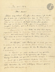 Camille SAINT-SAËNS (1835-1921). L.A.S., 30 avril 1919 ; 1 page et demie in-4 à son chiffre.{CR}Sur Parsifal de Richard Wagner [longtemps réservé à Bayreuth, l’opéra de Wagner fut donné à l’Opéra de Paris pour la première fois le 4...