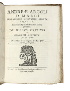 ARGOLI Andrea, De diebus criticis et aegrorum decubitu libri duo (-liber secundus). — Patavii : Paulum Frambottum Bibliopol., 1652. — In-4° (mm 230x160). — Pagine [8], 6, [2], 371, [13].