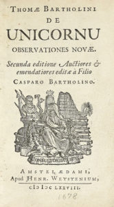 BARTHOLIN Thomas, De unicornu observationes novae. — Amstelaedami : apud J. Henr. Wetstenium, 1678. — In-12° (mm 135x80). — Pagine [16], 381, [15].