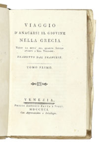 Prima edizione nella traduzione italiana di questo affascinante resoconto di viaggio immaginario, che tanta fortuna e influenza ebbe presso i contemporanei. Le belle tavole fuori testo raffigurano i luoghi e la topografia della Grecia classica. Cfr. Brunet I, 675 ; Graesse I, 300.
