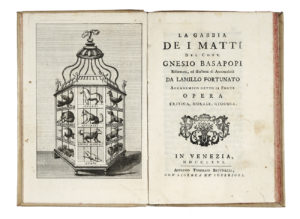 BASAPOPI Gnesio [pseud. di Bona Giulio Cesare], La gabbia de i matti [...] riformata, ed illustrata di annotazioni... — In Venezia : appresso Tommaso Bettinelli, 1766. — In-8° (mm 185x122). — VIII, 126, [1], 1 bianca con un'antiporta incisa in...