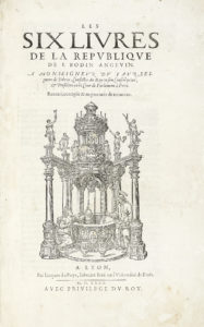 BODIN Jean, Les six livres de la Republique. —A Lyon : par Iacques du Puys, libraire iuré en l'Uniuersité de Paris, 1580. — (Al colophon:) A Lyon: de l'imprimerie de Iean de Tournes, 1579. — In folio (mm 257x225). — Pagine [12], 739, [19].