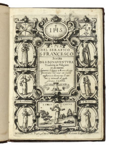 BONAVENTURA DA BAGNOREGIO (San), Vita del serafico S. Francesco [...] Tradotta in volgare, et di nuovo aggiuntovi le figure in rame... — In Venetia : presso gli heredi di Simon Galignani, 1598. — In-4° (mm 218x156). — Pagine [8], 160.