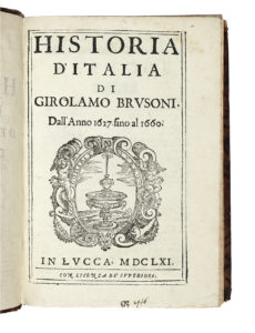 BRUSONI Girolamo, Dell'historia d'Italia di Girolamo Brusoni. — Dall'anno 1625 sino al 1660 Libri ventiotto. — In Lucca : s.e., 1661. — In-4° (mm 225x155). — Pagine [28], 990, 2 bianche.