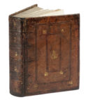 Frontespizio impresso a due colori e figurato, altri legni nel testo e in fine. Copia priva dell'ultima carta bianca, con lievi e marginali gore. Legatura restaurata e rimontata in piena pelle con cornici di filetti impressi a secco e piccolo medaglione, impresso in oro, a ciascun piatto. (1)