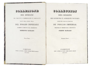 CACIALLI Giuseppe, Collezione dei disegni di nuove fabbriche e ornati fatti nella Regia Villa del Poggio Imperiale. — Parte prima (-seconda). — Firenze : presso l'autore e presso Giuseppe Molini libraio, 1823. — In folio (mm 465x320). —...
