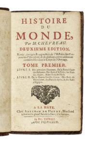 CHEVREAU Urbain, Histoire du monde... Tome premier (-cinquieme). — A La Haye: chez Abraham de Hondt, 1698. — 5 volumi in-12° (mm 154x92).