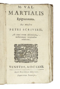 SI AGGIUNGE : Martialis Marcus Valerius, Epigrammata. Venetiis : Apud Benedictum Milochum, 1672. In-12° (mm 148x85). (3)-
