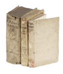 Marca aldina al frontespizio. Primo fascicolo macchiato, gora d'acqua nel margine della prima parte delle carte, un piccolo lavoro di tarlo in fine volume. Legatura coeva in piena pergamena floscia con titolo manoscritto al dorso.