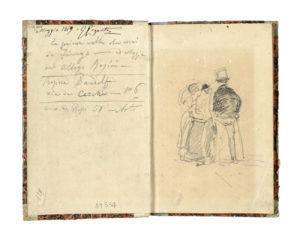 Copia arricchita dalla presenza, in principio e fine volume, di disegni attribuibili alla mano di Giacinto Gigante ; di particolare bellezza il disegno a doppia pagina realizzato alle ultime due carte di guardia, raffigurante uno scorcio di piazza della Signoria e Palazzo Vecchio, annotato a penna, titolato e datato "La Signoria, 28 mag 1870". Legatura coeva in mezza pergamena con punte e piatti in carta marmorizzata. Titolo manoscritto al dorso. Al contropiatto anteriore nota manoscritta "Maggio 1869 G. Gigante". (1)-