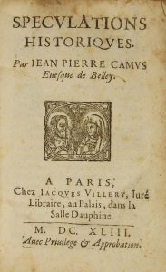 CAMUS (Jean-Pierre). SPECULATIONS HISTÒRIQUES. Paris, Jacques Villery, 1643. In-8 de [8]-327-[1] pages, vélin souple (Reliure de l'époque)