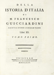 Ottima edizione, curata da Pio Bonsi, della Historia d'Italia del Guicciardini, impreziosita da un ritratto dell'Autore inciso dall'Allegrini. Graesse III, 177 ; Parenti, Diz. luoghi di stampa, 96 ; Brunet II 1804 : «édition la meilleure que jusqu'alors on eut encore donnée de cet historien».