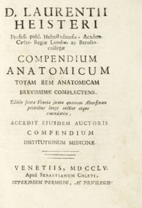 HEISTER Lorenz, Compendium anatomicum totam rem anatomicam brevissime complectens. — Venetiis : apud Sebastianum Coleti, 1755. — In-8° (mm 180x125). — Pagine XVIII, 486 [i.e. 484] con 9 tavole ripiegate fuori testo.
