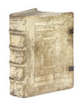 Marca editoriale impressa in legno ripetuta in principio e fine di volume. Fori di tarlo nel testo con perdita di parte di lettere nei primi fascicoli, prime carte con mancanze in corrispondenza dell'angolo inferiore esterno, copia marginalmente gorata ma complessivamente completa e ben conservata. Legatura in piena pelle di scrofa con ampie impressioni concentriche a motivo religioso ai piatti ; al piatto anteriore sigla "I.D.V." impressa a secco e ripassata a inchiostro. Fermagli metallici conservati. Spellature a piatti e dorso, alcune mancanze in corrispondenza della cuffia inferiore. Note manoscritte in principio di volume ; un ex-libris di precedente collezione applicato al contropiatto anteriore. Copia parzialmente postillata. (1)