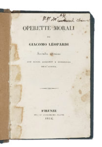 LEOPARDI Giacomo, Operette morali [...] seconda edizione. — Firenze : presso Guglielmo Piatti, 1834. — In-12° (mm 145x100). — Pagine 292.