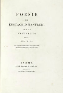 MANFREDI Eustachio, Poesie [...] con un ristretto della sua vita ed alcuni componimenti recitati in occasione della sua morte Parma : Nel regal palazzo co' tipi bodoniani, 1793. — In-8° (mm 210x145). Pagine [12], XXI, [3], 196 con un ritratto...