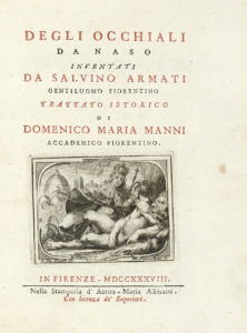 MANNI Domenico Maria, Degli occhiali da naso inventati da Salvino Armati... — In Firenze : Nella stamperia d'Anton-Maria Albizzini, 1738. — In-4° (mm 205x160). — [2], XXIV, 84.