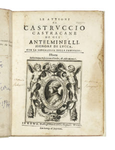 Prima rara edizione della vita di Castracane e unica opera impressa dai torchi del Gigliotti per Aldo il giovane. L'opera fu fortemente voluta anche da Bernardino Antelminelli, menzionato nell'introduzione, che rivendicava la discendenza diretta dal celebre condottiero. Cfr. Adams M-439 ; Brunet III 1387 ; Gamba 1504 ; Graesse IV, 376 ; Haym I, 236 ; Lozzi I 2396 ; Moreni II, 34 ; Renouard 246.10.