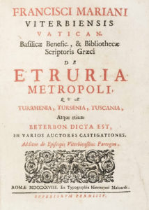 MARIANI Francesco, De Etruria metropoli, quae Turrhenia, Tursenia, Tuscania...— Romae : ex typographia Hieronymi Mainardi, 1728. — In-4° (mm 217x155). — Pagine XXI, [3], 290, [2] con due carte di tavole incise in rame fuori testo e più volte...