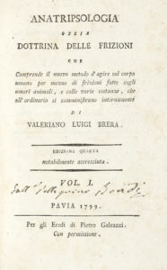 SI AGGIUNGONO : James, Metodo di amministrare la polvere antifebbrile. Napoli : s.e., 1799. In-8° (mm 178x115). Brera Valeriani Luigi, Anatripsologia ossia dottrina delle frizioni. Vol I (-II). Pavia : per gli eredi di Pietro Galeazzi, 1799. 2 parti in 1 volume in-8° (mm 203x125). Capuron F., Corso teorico e pratico di ostetricia. Venezia : dalla tipografia di Paolo Lampato, 1834. 1 volume in-8° (mm 225x115). (5)-