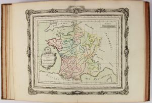 Paris, chez l’auteur, 1772. In-4°, demi veau, dos orné de fleurs dorés, tranches rouges (reliure de l’époque). Bel atlas entièrement monté sur onglet. Il se compose d’un titre double gravé, d’une table, de 2 grandes cartes dépliantes (projection Géo-Sphérique de la France de 1765, provinces de France), et de 35 cartes doubles avec les contours en coloris d’époque, toutes placées dans de larges encadrements. Le supplément à la carte des parlements manque. Bon exemplaire, les coloris sont frais.