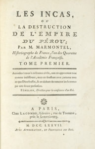 MARMONTEL Jean Francois, Les Incas, ou La destruction de l'Empire du Pérou... — Tome premier (-second). A — Paris : chez Lacombe, 1777. — 18 volumi in-8° (mm 230x145). — Con numerose mappe e vedute in calcografia fuori testo.