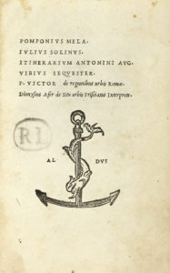 MELA POMPONIUS, Pomponius Mela. — Iulius Solinus. — Itinerarium Antonini Aug. Vibius Sequester. P. Victor de regionibus urbis Romae. — Dionysius Afer de situ orbis Prisciano interprete. — (Al colophon :) Venetiis : in aedibus Aldi et Andreae...