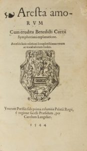 Livre célèbre, le texte des arrêts d’amour est en français avec les notes de Benoìt Le Court. Les Arrêts d’amour sont des questions de droit et de procédure accommodés à la manière des amours ; ce n’était qu’un cadre imaginé pour consigner les formes... pour les mettre à la portée des gens du monde, en les appliquant à des espèces fictives et galantes. Bon exemplaire (Gay I, 272) (Brunet III, 1483) (Adams M, 686).