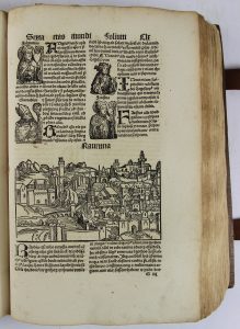 SANS DOUTE L’INCUNABLE LE PLUS CELEBRE. La chronique de Nuremberg est à la fois un traité d’histoire, de géographie et de philosophie. Elle offre l’histoire de l’humanité divisée en 6 grandes périodes à l’instar de la création du monde, avec un septième jour relatant la venue de l’Antéchrist et la fin de la civilisation. Monumental ouvrage qui comporte plus de 1800 gravures sur bois, dont près de 100 vues de villes, de nombreuses figures de dimensions variées et une carte de l’Europe sur double page. Cette illustration est faite d’après Michel Wolgemut, le maitre de Durer et Wilhem Pleydenwurf. Première édition latine, d’un format plus petit que l’original imprimé par Koberger en 1493, elle n’en est pas moins rare, surtout en reliure d’époque comme c’est le cas dans cet exemplaire. Quelques défauts mineurs avec un manque au bois représentant la ville de Bâle, quelques feuillets reliés court en marge de fond. (Hain, 14509) (Goff S. 308) (BMC II, 370).