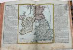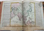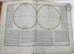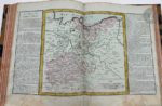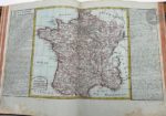 CLOUET (Jean-Baptiste Louis). Géographie moderne avec une introduction. Ouvrage utile à tous ceux qui veulent se perfectionner dans cette Science, on y trouve jusqu'aux notions les plus simples dont on a facilité l'intelligence par des Figures pour le mettre à la portée de tout le Monde, Chaque Carte a sur les marges l'explication de ce qu'elle renferme, la méthode qu'on y suit a pour objet de développer les connoissances qui tiennent à l'Histoire, ce qui rend cette Géographie très intéressante. Paris : Mondhare, Jean, 1787. —Atlas in-folio, demi-basane blonde marbrée, dos lisse, tranches rouges (reliure du début du XXe siècle). Nouvelle édition « corrigée et augmentée des Nouvelles découvertes du Célèbre Capitaine Cook et des Changements arrivés dans l'Amérique Septentrional ». Cet exemplaire comprend le titre allégorique gravé par Berthault, la page de dédicace «A messieurs de l'Académie Royale des Sciences er Belles Lettres de Rouen », gravée par Petit, et 64 cartes sur double page, légendées et entièrement gravées, montées sur onglets, sur les 68 requises. Il manque les cartes 50 à 53. Fentes aux charnières, épidermures. Mouillures dans la marge inférieure de la plupart des cartes, avec parfois atteinte à la carte. Les trois dernières cartes présentent des déchirures au niveau des mouillures, avec quelques manques et atteintes aux cartes. Les marges supérieures des cartes 54 et 68 ont été découpées, avec atteinte au cadre et au numéro pour la carte 68.