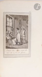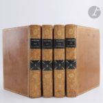 LESAGE (Alain René). Histoire de Gil Blas de Santillane. Paris : Janet, Hubert, l’an troisième [1795]. — 4 volumes in-8, veau blond, roulette dorée en encadrement sur les plats, dos lisse orné, roulette dorée intérieure, tranches dorées (reliure de l'époque). Très belle édition illustrée de cent figures hors texte gravées sous la direction de Hubert d’après les dessins de Bornet, Charpentier et Duplessis-Bertaux. Très bel exemplaire en reliure de l'époque, d'une grande élégance. Dos très légèrement éclairci. Quelques minimes frottements d'usage et petites taches sur les plats.