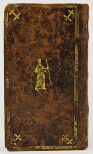 un pèlerin entouré de 4 croix dorées (Reliure de l’époque)