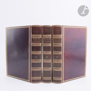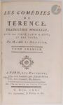 TÉRENCE. Les Comédies. Traduction nouvelle, avec le texte latin à côté, et des notes. Par M. l'Abbé le Monnier. Paris : Charles-Antoine Jombert père et fils, 1771. — 3 volumes in-8, maroquin violet, triple filet doré en encadrement sur les plats, dos à nerfs orné, roulette dorée intérieure, tranches dorées (reliure du XIXe siècle). Édition originale de la traduction par l'abbé Guillaume Antoine Lemonnier (1721-1797) des comédies de Térence. Elle est dédiée à la marquise de La Vaupallière, et illustrée, en premier tirage, d'un frontispice et de six belles planches, gravés par Choffard, Prévost, Rousseau et Saint-Aubin, d'après Cochin fils. Très bel exemplaire. Dos et bords des plats très légèrement passés. Rousseurs éparses.