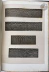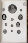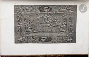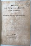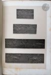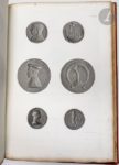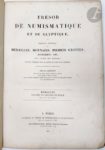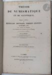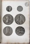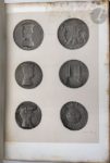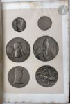DELAROCHE (Paul). Trésor de numismatique et de glyptique ou recueil général de médailles, monnaies, pierres gravées bas-reliefs, etc., tant anciens que modernes, les plus intéressans sous le rapport de l'art et de l'histoire. Paris : Rittner et Goupil, 1834-1836 ; Paris : Didier et Cie, 1858. — 5 volumes in-folio, reliures distinctes. Ensemble de 4, dont un en double, des 20 volumes de l'édition de 1834-1850, et l'un des 13 volumes de l'édition de 1858 de ce rare et remarquable ouvrage scientifique, publiés par Paul Delaroche et abondamment illustré d'après les procédés de M. Achille Collas. Il comprend : - Trésor de numismatique et de glyptique…Médailles coulées et ciselées en Italie aux XVe et XVIe siècle. Paris : Bureau du Trésor de numismatique et de glyptique, Rittner et Goupil, 1834. —Demi-maroquin rouge à coins, filets dorés, dos lisse orné, non rogné (reliure de l'époque). Illustrée de 40 planches. Épreuves sur chine collé. Frottements et épidermures à la reliure, coins émousses. Importante mouillure sur le haut des plats et des feuillets, rousseurs. - Le même. — Toile rouge à la Bradel, dos lisse, non rogné (reliure de l'époque). Charnières fendues, déchirures au dos et sur le bord des plats, coins émoussés. Rousseurs et quelques traces de mouillures. Épreuves sur blanc - Trésor de numismatique et de glyptique… Médailles françaises depuis le règne de Charles VII jusqu'à celui de Louis XVI. 2e partie - Œuvre de Dupré et Warin. Paris : Bureau du Trésor de numismatique et de glyptique, Rittner et Goupil, 1836. — Papier chagriné rouge à la Bradel, dos lisse, non rogné (reliure de l'époque). Illustrée de 37 planches. Épreuves sur blanc. Bords et coiffes frottés avec manques, coins émoussés. Rousseurs et quelques mouillures. - Trésor de numismatique et de glyptique…Bas-relief du Parthénon et du temple de Phigalie. Paris : Bureau du Trésor de numismatique et de glyptique, Rittner et Goupil, 1834. —Demi-maroquin rouge à coins, filets dorés, dos lisse orné, non rogné (reliure de l'époque). Illustrée de 16 planches. Épreuves sur chine collé. Frottements et épidermures, coins émoussés. Rousseurs et mouillures. - Trésor de numismatique et de glyptique… Recueil général de bas-reliefs et d'ornements. Première partie. Paris : Didier et Cie, 1858. —Demi-maroquin rouge à coins, filets dorés, dos à nerfs orné, tête dorée (reliure de l'époque). Illustrée de 40 planches. Frottements et épidermures, mouillure sur le haut des plats et des feuillets. Rousseurs éparses. Joint : - HERGOTT(Marquart). Monumenta Augustae domus Austriacae… Fribourg, 1743. — In-folio, demi-maroquin marron à long grain, dos lisse orné (reliure du XIXe siècle). Recueil comprenant le frontispice et les 44 planches seuls du second volume de cet ouvrage de médailles. Reliure en très mauvais état de conservation.