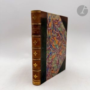 FRANCE (Anatole) - MUCHA (Alphonse). Clio. Paris, Calmann Lévy, 1900. — In-8, demi-chagrin vert foncé à coins, dos à nerfs orné, non rogné (reliure de l'époque). Édition originale dédiée à Émile Zola de ce recueil de 5 contes d'Anatole France : « Le Chantier de Kymé. » - « Komm l'atrébate.» - « Farinata degli Uberti ou la guerre civile. » - « Le Roi boit. » - «"La Muiron". » Édition recherchée en raison notamment des belles compositions d'Alphonse Mucha qui a réalisé 13 illustrations en couleurs dont une sur la couverture, répétée en noir sur le titre, 5 en tête de chacun des contes et 7 à pleine page. Exemplaire sur papier d'édition. Dos et bords des plats passés.