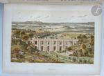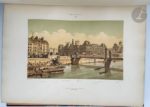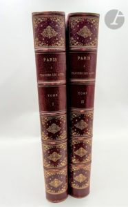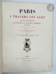HOFFBAUER (Fedor). Paris à travers les âges. Aspects successifs des monuments et quartiers historiques de Paris depuis le XIIIe siècle jusqu’à nos jours. Paris : Librairie de Firmin Didot et Cie, 1875-1882. — 2 volumes in-folio, demi-maroquin rouge à coins, filets dorés, dos à nerfs orné, tête dorée, non rogné (reliure de l'époque). Édition originale de l’un des plus beaux livres du XIXe siècle sur l’histoire de Paris. Parue en livraison, cette publication est formée de deux volumes de textes composés spécialement pour ce livre par Édouard Drumont, Anatole de Montaiglon, Édouard Fournier, Alfred Bonnardot, Jules Cousin, l’abbé Valentin Dufour, Paul Lacroix, Ch. Jourdain, Alfred Franklin et Lazare-Maurice Tisserand. Ces textes, imprimés sur fond teinté, portent sur les lieux de Paris les plus pittoresques et les plus intéressants d’un point de vue historique ; ainsi se succèdent l’Hôtel de Ville, le Louvre, le Châtelet, le cimetière des innocents, la Bastille, la Tour de Nesle, la pointe de la Cité, etc. L’illustration comprend de très nombreuses figures sur bois dans le texte, de la reproduction du plan de Paris sous Henri II d’Olivier Truschet et Germain Hoyau, de 23 planches de plans de l’ancien Paris, ainsi que de 68 lithographies en couleurs réalisées à partir des dessins de l’architecte Fedor Hoffbauer. Dans ces dernières, on découvre une vue de Lutèce ainsi que les divers quartiers de Paris décrits dans les volumes de texte, présentés selon le même point de vue, depuis le Moyen Âge ou le XVIe siècle jusqu’à l’époque de l’ouvrage. Les 23 plans de l’ancien Paris sont chacun accompagnés d’un papier transparent sur lequel est imprimé le plan équivalent du Paris à l’époque du livre, servant à nous rendre compte de l’évolution de la ville dans le temps. Bon exemplaire en reliure de l'époque, entièrement monté sur onglets. Quelques légers frottements d'usage. Rousseurs éparses. Perforation touchant le cadre et la marge des pages 3-4 et 41-42 de la partie consacrée à Notre-Dame dans le premier volume.