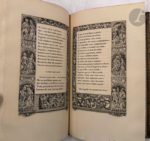 HOLBEIN (Hans). L’Alphabet de la mort de Hans Holbein Entoure de bordures du XVIe siècle et suivi d’anciens poëmes français sur le sujet des trois mors et des trois vis. Paris : Firmin Didot frères pour Edwin Tross, 1856. —In-8, maroquin noir, filets à froid en encadrement sur les plats, dos à nerfs, roulette dorée intérieure, tête dorée, non rogné, couverture conservée (Comasso). Édition publiée par Anatole de Montaiglon, reproduisant l’alphabet de la mort dessiné par Hans Holbein et gravé à l’époque par H. Lutzelburger. Cette reproduction a été faite par Heinrich Loedel ou Lödel de Gottinguen, d’après l’exemplaire de Dresde. Chaque lettre est accompagnée d’une courte sentence sur la mort tirée d’auteurs anciens et l’alphabet est suivi de différents Dits des Trois Mors et des Trois Vis tirés de divers manuscrits du XIIIe siècle. Le texte est encadré de bordures tirées des Heures de Simon Vostre, gravées par Léon le Maire. Exemplaire sur papier vergé, parfaitement relié à l'époque par le relieur stéphanois Comasso pour la bibliothèque de Claude Henri Palluat de Besset (1806-1886) au château de La Salle, membre de l'une des plus importantes familles industrielles de Saint-Étienne, qui acquit le dit château en 1841. Provenance : Claude Henri Palluat de Besset, avec cachet de la bibliothèque du château de La Salle.