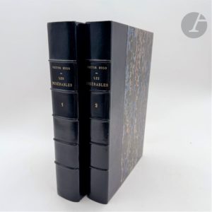 HUGO (Victor). Les Misérables. Paris : Eugène Hugues, [1879-1882]. —5 parties en deux volumes in-8, demi-chagrin noir, dos à nerfs, tête dorée, couvertures et dos conservés (Lobstein-Laurenchet). Belle édition faisant partie des œuvres complètes de Victor Hugo publiées par Eugène Hugues entre 1876 et 1897. Elle est illustrée de nombreuses gravures sur bois dans le texte et à pleine page d'après les dessins de nombreux artistes dont Edmond Morin, Daniel Vierge, Adrien Marie, Brion, Eugène Delacroix, Vogel, Benett, etc., toutes en premier tirage à l'exception de celles de Brion. UN DES 50 EXEMPLAIRES NUMÉROTÉS SUR PAPIER DE CHINE, seul tirage sur grand papier. Bel exemplaire relié par Lobstein-Laurenchet, complets des plats et des dos des couvertures générales. Rousseurs éparses.
