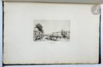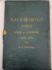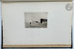 LALANNE (Maxime François Antoine). Souvenirs artistiques du Siège de Paris 1870-1871. Paris : Cadart et Luce, [1871]. [Suivis de] : YON (Edmond). Autour de Paris après la guerre. Paris : Cadart et Luce, [1872]. —2 albums en un volume in-folio, percaline verte, titre « Eaux-fortes Paris Siège & Comune 1870-1871 par A. P. Martial » doré sur le premier plar, dos lisse, premiers plats de couverture conservés (reliure de l'époque). Recueil de deux beaux albums de 12 eaux-fortes chacun, consacrés au siège de Paris en 1870 et 1871. Ils font partie d'une série de 7 albums publiés par Cadart et Luce en 1871 et 1872. Le premier du présent exemplaire est l'œuvre du dessinateur et graveur Maxime François Antoine LALANNE (1827-1886), élève de Gigoux, et le second d'Edmond Charles Joseph YON (1838-1897). Exemplaires complets des premiers plats de couverture gravés à l'eau-forte. On trouve également après la première couverture un feuillet présentant une gravure signée de Masson et donnant la liste des albums publiés par Cadart sur le Siège de Paris. Exemplaire en cartonnage d'éditeur mais il ne correspond pas à ce qui est à l'intérieur. Il mentionne effectivement les deux albums donnés dans la même série par Martial sur Paris pendant le Siège et sous la Commune. Les épreuves sont sur papier vergé. Cartonnage très abîmé au dos avec déchirures et manques débordant sur le premier plat. Traces d'humidité sur les plats. Les deux couvertures et le feuillet gravé par Masson sont entièrement brunis. Les 24 gravures sont parfaitement conservées.