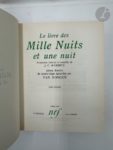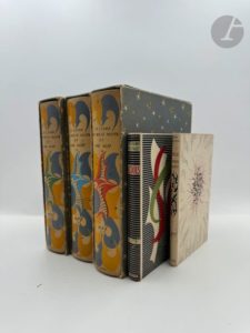[CARTONNAGES NRF]. Ensemble de 3 ouvrages en cartonnage NRF : - APOLLINAIRE (Guillaume). Alcools. Poèmes 1898-1913. Paris : Gallimard, [1944]. —In-12, cartonnage de l'éditeur. Un des 1040 exemplaires sur Héliona des Papeteries Navarre, reliés d'après une maquette de Paul Bonet. Exemplaire bien conservé. - ÉLUARD (Paul). Poésie ininterrompue. Paris : Gallimard, [1946]. —In-12, cartonnage de l'éditeur. Édition originale. Un des 1040 reliés d'après une maquette de Paul Bonet. Bon exemplaire. - MARDRUS. Le Livre des Mille Nuits et une nuit. Traduction littérale et complète de J. C. Mardrus. Édition illustrée de quatre-vingts aquarelles par Van Dongen. Paris : Fasquelle, Gallimard, 1935. —3 volumes in-8, cartonnage de l'éditeur, étui. Un des 13750 exemplaires reliés d'après une maquette de Paul Bonet. Charnières du premier volume fendues.
