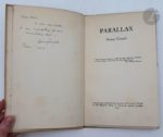 CUNARD (Nancy). Parallax. London : Leonard et Virginia Woolf, The Hogarth Press, 1925. —In-8, cartonnage illustré de l'éditeur. Édition originale publiée par le couple Leonard et Virginia Woolf, de ce texte poétique de la poétesse et militante politique anglaise Nancy Cunard (1896-1965). Ce petit volume de seulement 24 pages, fut tiré à 420 exemplaires sur papier vergé, non numérotés. Le beau cartonnage a été illustré d'une composition du peintre, pianiste et écrivain américain Eugene McCown (1898-1966), l'une des figures du quartier du Montparnasse et de ses cafés. Exemplaire enrichi de cet envoi autographe signée : «Cher Marc, // A vous mon livre, // et ma sympathie, que vous // connaissez déjà. // Nancy Cunard. // Paris. 1925. » Salissures au cartonnage, frottements au dos et sur les bords des plats. Parfait état intérieur.