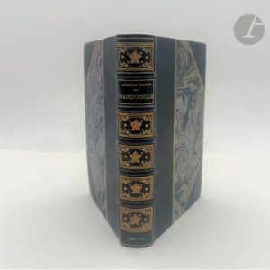 FRANCE (Anatole). Crainquebille, Putois, Riquet et plusieurs autres récits profitables. Paris : Calmann-Lévy, [1904]. — In-16, demi-maroquin bleu foncé à coins, filets dorés, dos à nerfs orné de motifs dorés et de fleurs dorées et mosaïquées de maroquin rouge, tête dorée, non rogné, couverture et dos conservés (reliure vers 1930). Édition en partie originale. Exemplaire unique, enrichi de 40 dessins originaux à la plume du peintre et dessinateur belge Émile-Antoine COULON (vers 1868-vers 1937) qui fut notamment élève de Félicien Rops. L'artiste a écrit cette note au verso du titre : « Cet exemplaire est illustré de quarante dessins à la plume, par le soussigné, peintre-illustrateur, exerçant son art à Paris, la marque C remplaçant ici la signature : Émile-Antoine Coulon. Bruxelles, le 15 janvier 1921. » Très bel exemplaire.
