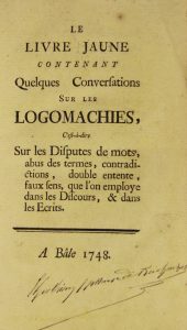 [BASIN (G)]. LE LIVRE JAUNE CONTENANT QUELQUES CONVERSATIONS SUR LES LOGOMACHIES, c’est-à-dire sur les disputes de mots, abus des termes,... Bâle, sans nom, 1748. In-8° de [24]-184 pages, demi basane, dos orné à froid (Reliure de l’époque)
