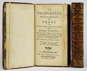 BONNET (Charles). LA PALINGENESIE PHILOSOPHIQUE, OU IDEES SUR L’ETAT PASSE ET SUR L’ETAT FUTUR DES ETRES VIVANTS. Amsterdam, Marc Michel Rey, 1769. 4 tomes en 2 vol. in-12, basane claire, dos orné (Reliure de l’époque).
